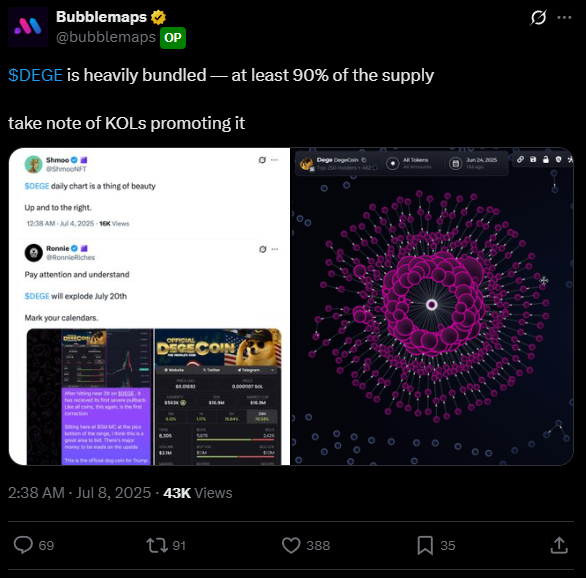 This technique, known as bundling, is a relatively new evolution of the classic pump-and-dump. As on-chain analysts like Bubblemaps have shown, scammers now utilize automation to create hundreds or even thousands of wallets, all of which trade in rapid succession. To the average investor, it mimics virality — a token catching fire with “real” buyers. In the heat of a bull market, that illusion is often enough to trigger FOMO and attract genuine money.