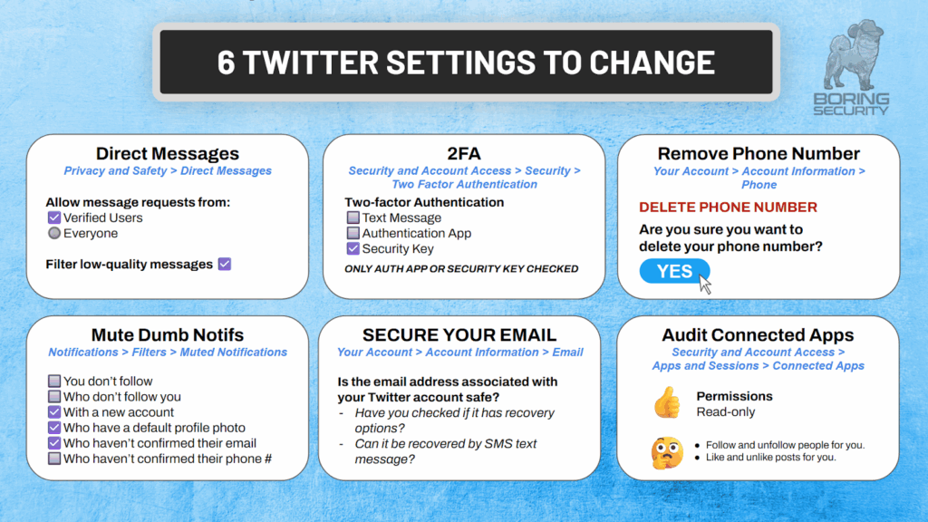 Figure 3: Six Twitter Settings to Change, From Boring Security’s Social Media Security class