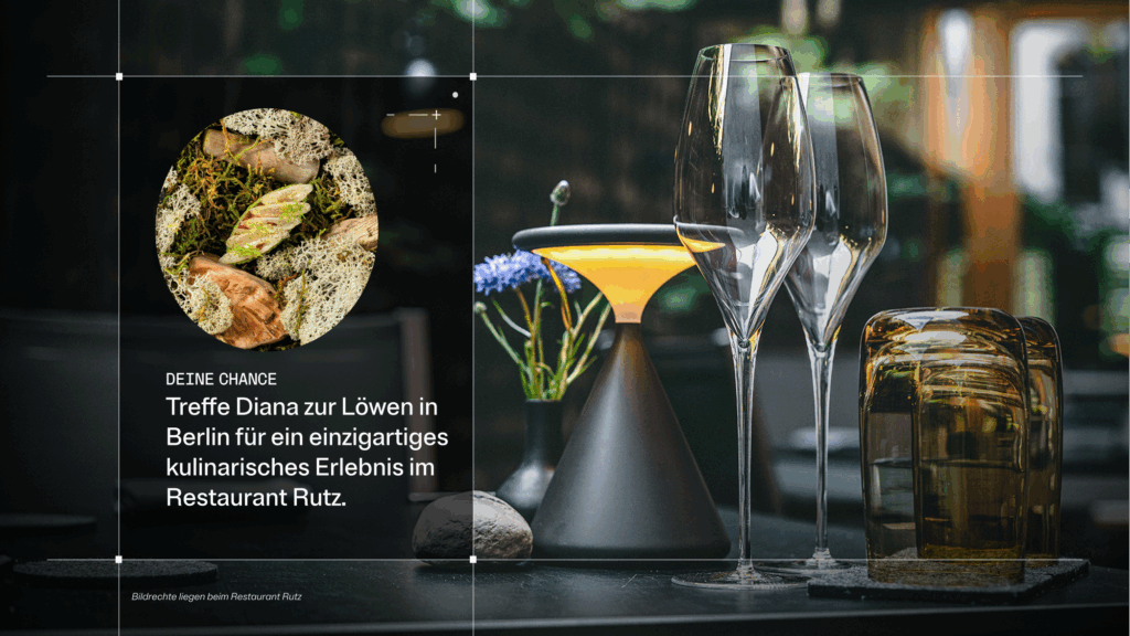 Der Abend umfasst ein 13-Gänge-Degustationsmenü mit Weinbegleitung und Kaviar sowie eine private Tour durch das Restaurant, inklusive Zugang zur Küche und zum Weinkeller. Das Rutz hat die Genehmigung für Dreharbeiten und Markenerwähnung erteilt – eine seltene Gelegenheit, einen Blick hinter die Kulissen der angesehensten kulinarischen Institutionen Deutschlands zu werfen.