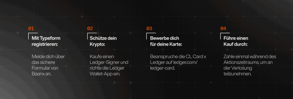 Mach aus der alltäglichen Nutzung von Krypto etwas ganz Besonderes. Hol dir die mit Ledger kompatible CL-Karte, sammle Prämien und registriere dich. Mit etwas Glück erlebst du gemeinsam mit Diana zur Löwen einen exklusiven Abend im Restaurant Rutz in Berlin, mit Fine Dining und Blicken hinter die Kulissen.