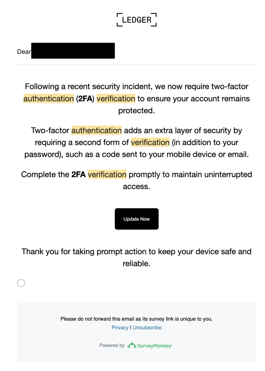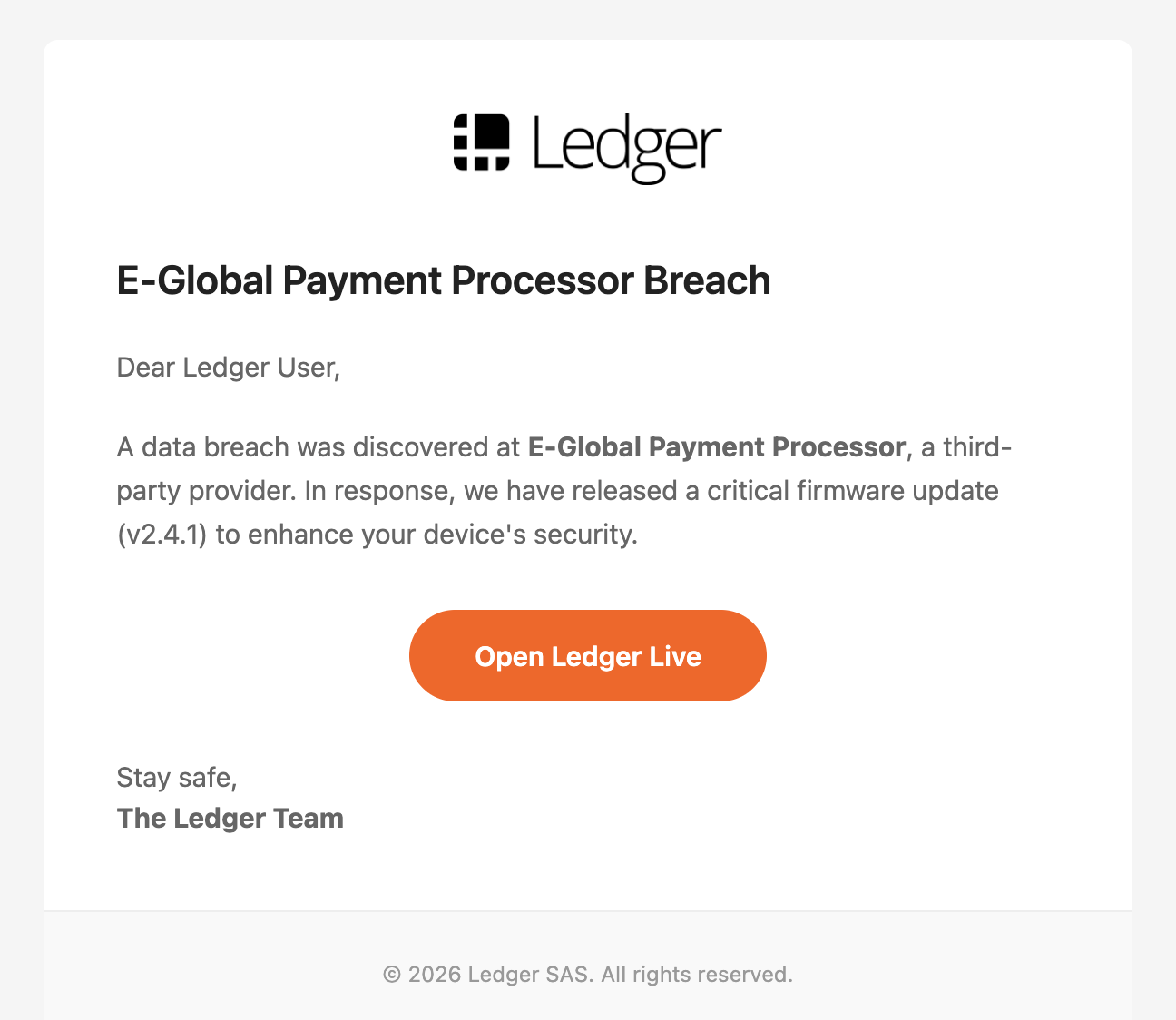Phishing attacks are unfortunately an all too common threat when using the internet. This page aims to make a list of some examples of phishing attacks we have received at Ledger targeting our customers. If you have any doubts about the authenticity of a communication from Ledger, you can refer to the list below highlighting some recent phishing campaigns.