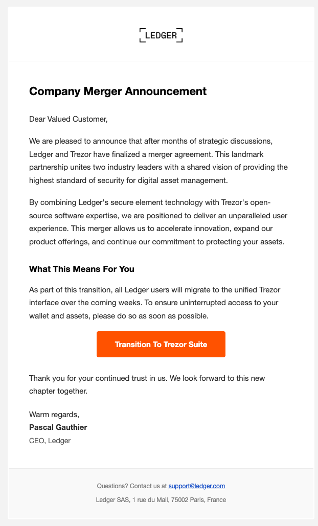 Thank you for taking the time to report a phishing email. It will help us identify potential new phishing campaigns. All reports are carefully reviewed by our team but please note that we don’t send individualized responses. If your inquiry requires a response from Ledger, please contact our Customer Support directly.
