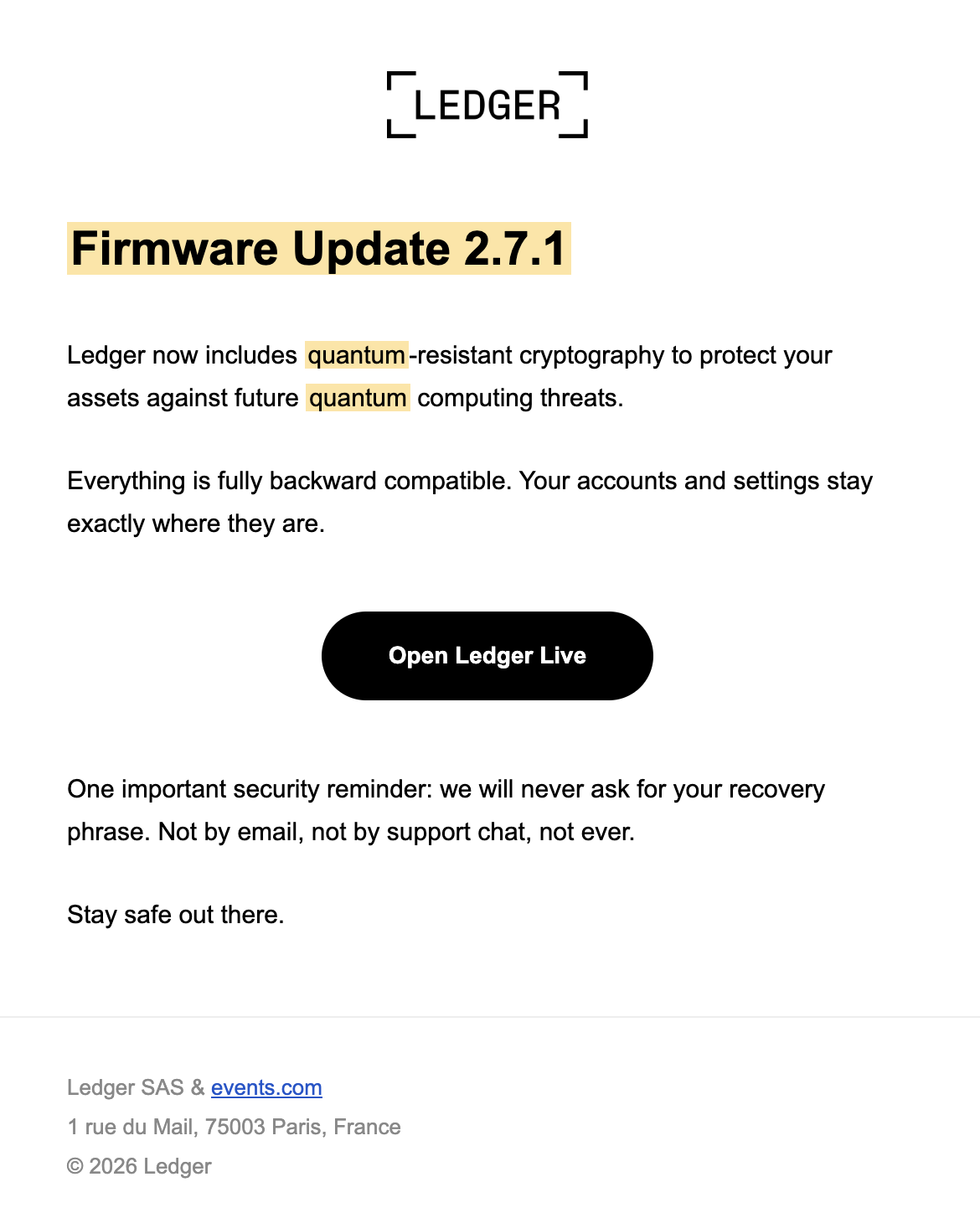 While Ledger does send out occasional marketing emails, we do not send out emails asking you to update device firmware/operating system, enable 2fa, or other similar actions.