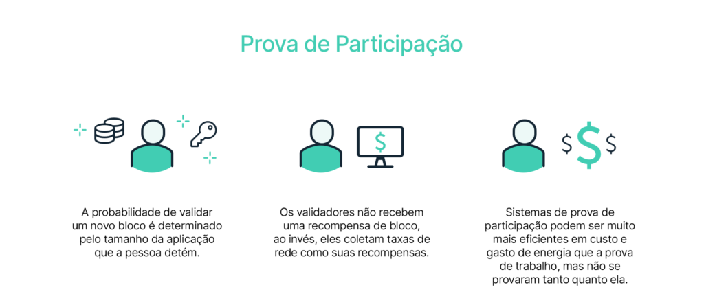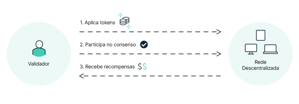 Prova de participação (PoS) é um algoritmo de consenso para redes de blockchains que se baseia em validadores selecionados aleatoriamente. Os validadores aplicam (ou “fazem stake”) de tokens na rede nativa, bloqueando-os na blockchain para produzir e aprovar blocos. Os validadores são recompensados com base na sua aplicação total, incentivando os nodes a validar a rede com base em um retorno sobre o investimento (ROI).