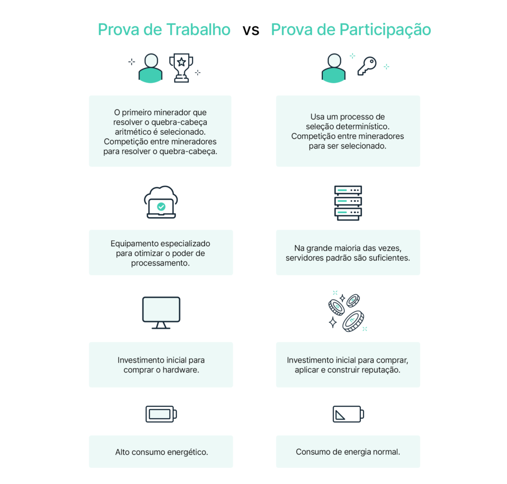 O PoS é visto em grande parte como o método mais sustentável e como uma versão mais escalável do mecanismo de consenso do Bitcoin, a Prova de Trabalho (PoW), que necessita de gastos significativos de energia.