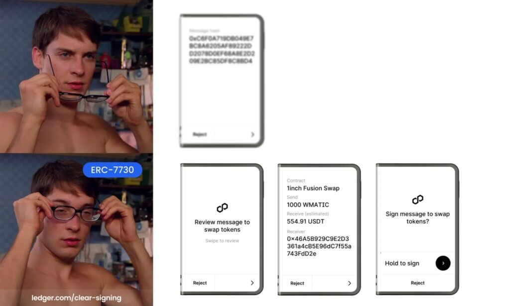 为了解决这个问题,Ledger 长期专注于推进和优化透明签名,从早期的插件到 2024 年启动透明签名倡议,积极推动透明签名在整个加密货币生态系统的普及。 在推进该倡议的过程中,Ledger 与其他行业领袖共同制定了开放标准 ERC-7730,该标准使用简单的 JSON 格式转换复杂的交易数据。